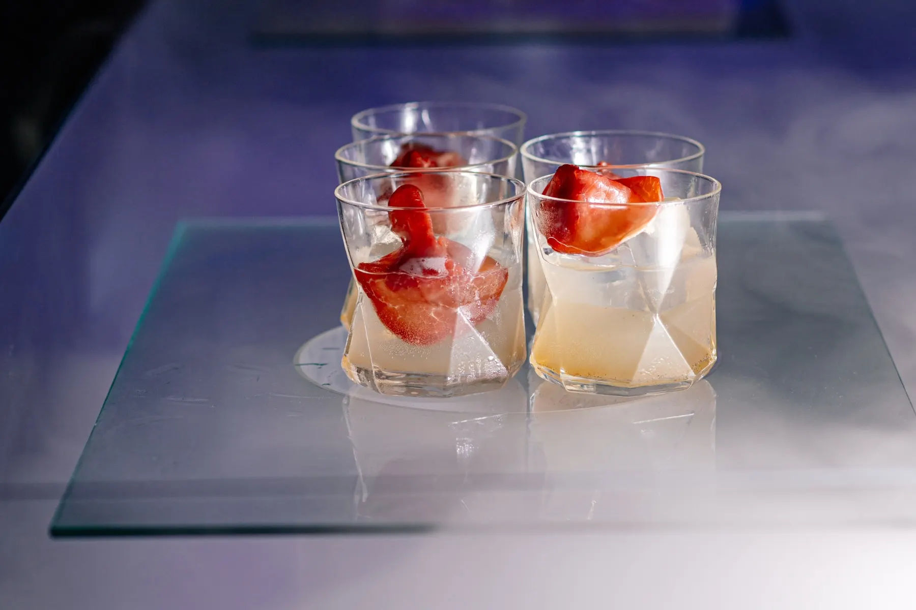 Omoda Signature drink podávaný z Infinity Cloud. Cocktail na základu infuzovaného ginu s kampotským pepřem, limetkovou šťávou, sodou a zázvorovým pivem. Součástí byla i sušená šunka a kostka ledu s logem Omoda.