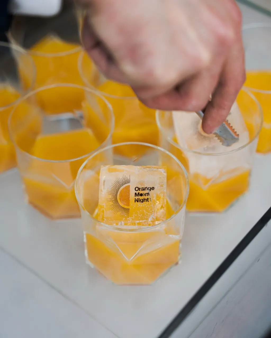 Our experiential specialties also attracted a lot of attention. Guests had the chance to try the Edible Cloud for the first time — a delicate foam that floated in the air and literally melted on the tongue. There was also our signature cocktail from the Infinity Cloud, complemented by an edible glass moon and an orange-colored cloud in the client’s brand colors.